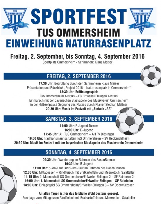 Der TuS Ommersheim hat einen Grund zu feiern: Das „Projekt 2016 – Naturrasenplatz in Ommersheim“ wurde vom Verein erfolgreich umgesetzt und vom 2. bis 4. September 2016 darf gefeiert werden.