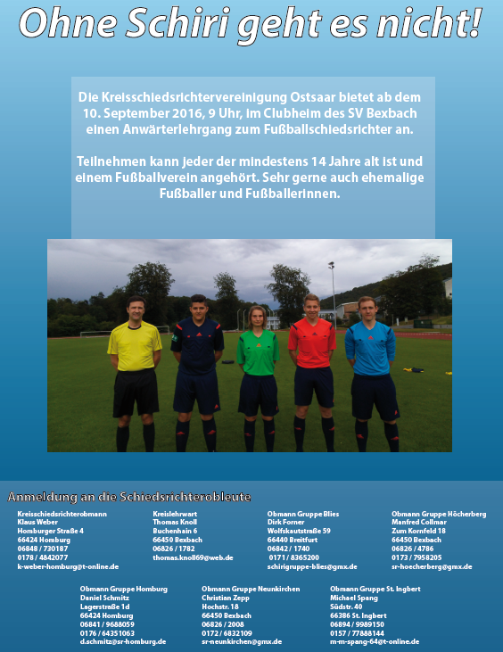 Der Ostsaarkreis sucht neue Schiedsrichter – Vereine haben die Möglichkeit ihr Schiedsrichtersoll zu erfüllen! Die Kreisschiedsrichtervereinigung Ostsaar bietet ab dem 10. September 2016, um 9:00 Uhr, im Clubheim des SV Bexbach (Auf der Heide) den nächsten Neulingslehrgang an und eröffnet den heimischen Vereinen damit erneut die Möglichkeit ihr vorgeschriebenes Schiedsrichtersoll zu erfüllen.