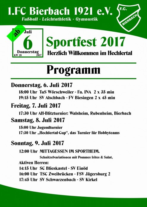 Auch beim Bezirksligisten des FC Bierbach steht in der kommenden Woche ein viertägiges Sportfest auf dem Porgramm: Am Donnerstag, den 6. Juli 2017 startet das Sportfest ab 18:00 Uhr mit einem Testspiel des TuS Wörschweiler gegen die Firma INA, ab 19:15 Uhr spielt der SV Alschbach gegen den FV Biesingen. Am Freitag, den 7. Juli 2017 findet ab 17:30 Uhr ein AH-Blitzturnier mit den SF Walsheim, dem TuS Rubenheim und dem heimischen FC Bierbach statt.