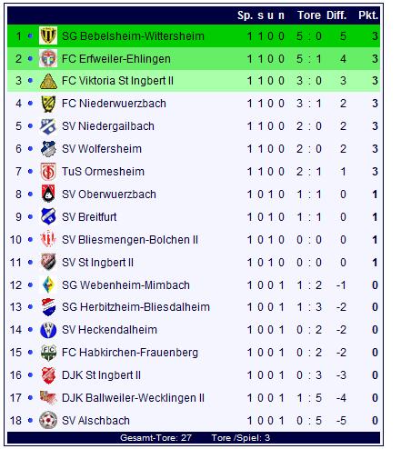 Auch die Tabelle der Kreisliga A Bliestal ist damit komplett, hat aber nach dem ersten Spieltag naturgemäß nur sehr wenig Aussagekraft: