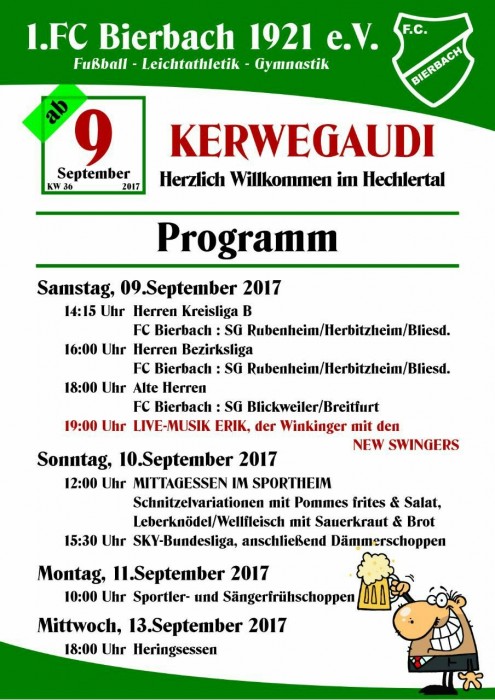 Der FC Bierbach feiert am Wochenende die Bierbacher Kerb: Am Samstag, den 9. September 2017 steht Fußball satt auf dem Programm, wenn um 14:15 Uhr und um 16:00 Uhr die beiden Aktiven Mannschaften des FC Bierbach die SG Rubenheim-Herbitzheim-Bliesdalheim empfangen. Ab 18:00 Uhr spielt die AH des FC Bierbach gegen die SG Blickweiler-Breitfurt.