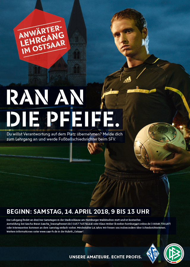 Die Schiedsrichter im Bliestal suchen derzeit händeringend nach Nachwuchs, habe man doch alleine in der Winterpause sechs Schiedsrichter verloren, wie der Obmann der Schiedsrichtergruppe Blies Dirk Forner SCB-Online erklärte und vor allem an die Unterstützung der Vereine appellierte: "Die Situation in der Schiedsrichtergruppe Blies spitzt sich derzeit dramatisch zu. Um einigermaßen die Lücken füllen zu können, brauchen wir von den Vereinen Unterstützung." Daher gibt es am Samstag, den 14. April 2018 von 9:00 bis 13:00 Uhr in der Stadionklause am Homburger Waldstadion nochmals einen Anwärterlehrgang im Ostsaarkreis. Anmeldung bei Sascha Braun (sascha_braun@freenet.de | 0157 74374144) oder Klaus Weber (k-weber-homburg@t-online.de | 06848 730187) oder Interessenten kommen an dem betreffenden Samstag einfach vorbei. Mindestalter 14 Jahre. Insbesondere Schiedsrichterinnen sind herzlich willkommen.