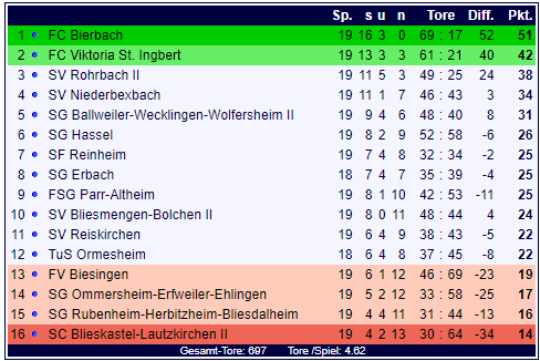 Der FV Biesingen verliert damit das Derby gegen die Reserve der SG Ballweiler-Wecklingen-Wolfersheim knapp mit 3:4 und steht mit 19 Punkten weiter auf einem potentiellen Abstiegsplatz, auf der anderen Seite kann sich die SG Ballweiler-Wecklingen-Wolfersheim II mit nunmehr 31 Punkten sogar auf Rang fünf festsetzen.