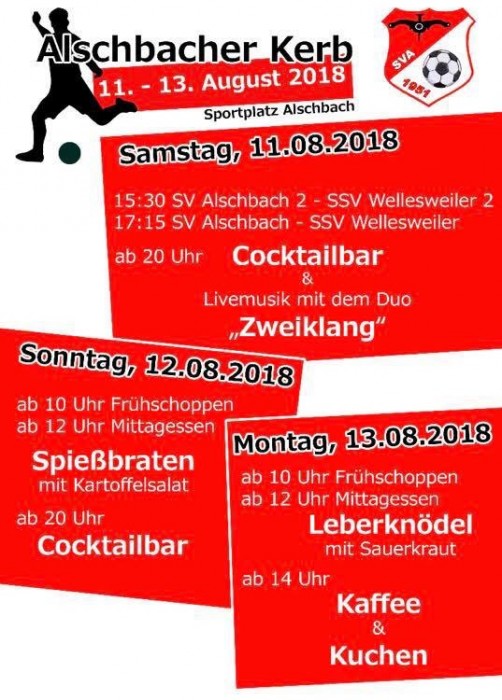 In Alschbach steht vom 11. bis zum 13. August 2018 alles im Zeichen der Kerb, die auf dem Sportplatzgelände des SV Alschbach stattfindet: Am Samstag, den 11. August 2018 spielt um 15:30 Uhr der SV Alschbach II gegen den SSV Wellesweiler II um 17:15 Uhr duellieren sich die beiden Ersten Mannschaften beider Vereine. Ab 20:00 Uhr öffnet die Cocktailbar und das Duo "Zweiklang" sorgt für die musikalische Untermalung. Am Sonntag, den 12. August 2018 steht ab 10:00 Uhr der Frühschoppen an, ab 12:00 Uhr gibt es Spießbraten mit Kartoffelsalat, ehe ab 20:00 Uhr erneut die Cocktailbar geöffnet ist. Am Montag, den 13. August 2018 startet erneut ab 10:00 Uhr der Frühschoppen, ehe ab 12:00 Uhr Leberknödel serbiert werden. Ab 14:00 Uhr werden Kaffee und Kuchen serviert.