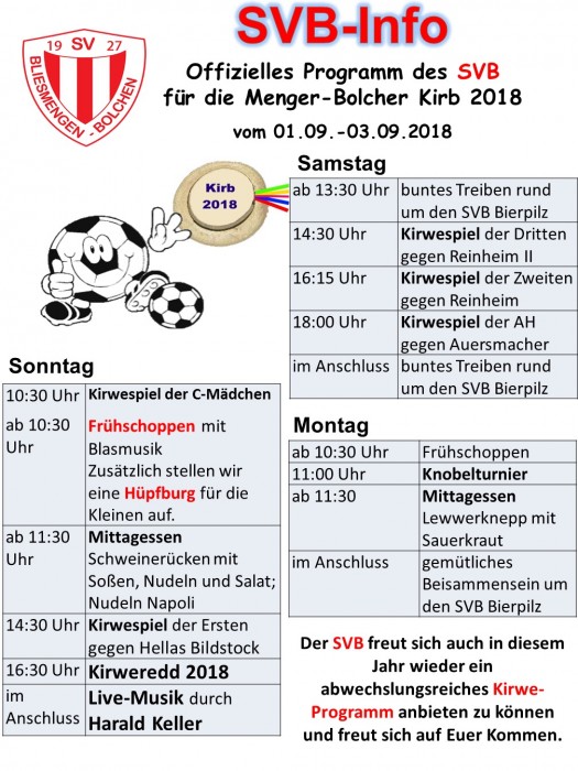Beim Verbandsligisten des SV Bliesmengen-Bolchen steht am Wochenende vom Samstag, den 1. September 2018 bis zum Montag, den 3. September 2018 die Kirmes auf dem Programm. Anlässlich der Bliesmengen-Bolcher "Kirb" spielen am Samstag die Dritte und Zweite Mannschaft des SV Bliesmengen-Bolchen auf eigenem Platz gegen die SF Reinheim, am Sonntag spielt dann um 14:30 Uhr die Erste Mannschaft gegen den Aufsteiger des SV Hellas Bildstock. Auch abseits des Fußballplatzes hat der SVB ein abwechslungsreiches Programm zusammengestellt:
