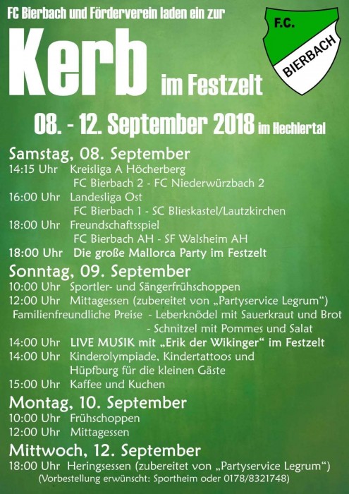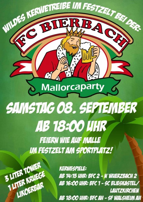 Am kommenden Wochenende steht beim FC Bierbach die Kirmes auf dem Programm und so lädt man zu zwei spannenden Kerwespielen: Am Samstag, den 8. September 2018 empfängt ab 14:15 Uhr zunächst die Zweite Mannschaft den FC Niederwürzbach II in der Kreisliga A Höcherberg, ehe in der Landesliga Ost der Spitzenreiter des SC Blieskastel-Lautzkirche ab 16:00 Uhr zu Gast ist. Die AH Teams des BFC und der SF Walsheim schließen ab 18:00 Uhr den Fußballtag ab, ehe es zur Mallorca-Party geht.