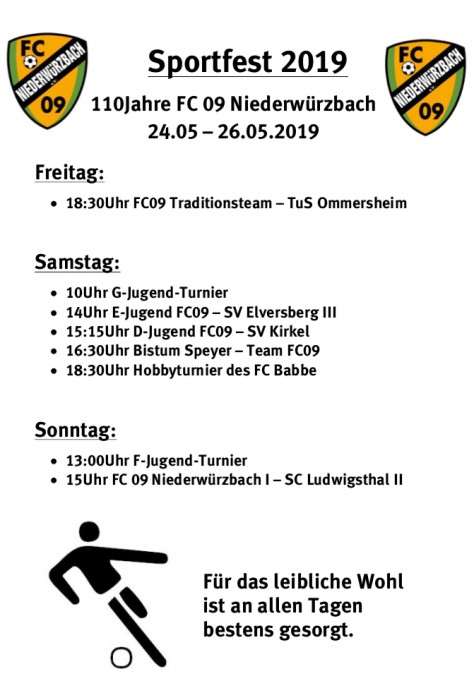 Auch am Samstag hat das Sportfest volles Programm mit Spielen von Jugend- und Hobbyteams zu bieten, am Sonntag steht dann nach einem F-Jugend-Turnier ab 15:00 Uhr das letzte Saisonspiel der Ersten Mannschaft des FCN gegen den SC Ludwigsthal II an.