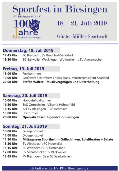Nicht nur der SV Blickweiler, sondern auch der FV Biesingen feiert im Jahr 2019 seinen 100sten Geburtstag. Der FVB feiert vom 18. bis zum 21. Juli 2019 sein 100-jähriges Vereinsbestehen mit einem großen Sportfest, an dem auch viele Bliestal-Teams vorspielen. Der große Festkommers findet am Freitag, den 19. Juli 2019 ab 17:30 Uhr im FVB-Sportheim statt.