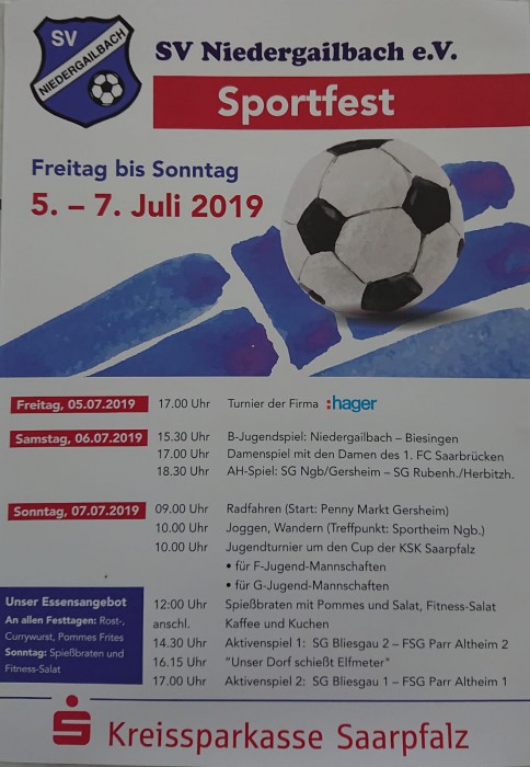 Auch beim SV Niedergailbach steht vom Freitag, den 5. Juli 2019 bis zum Sonntag, den 7. Juli 2019 das Sportfest auf dem Programm. Neben Fußballspielen von Jugend- und Aktivenmannschaften stehen auch andere Sportarten wie Joggen und Radfahren im Fokus. Am Sonntag, den 7. Juli 2019 spielt die SG Bliesgau mit beiden Mannschaften gegen die FSG Paar-Altheim.