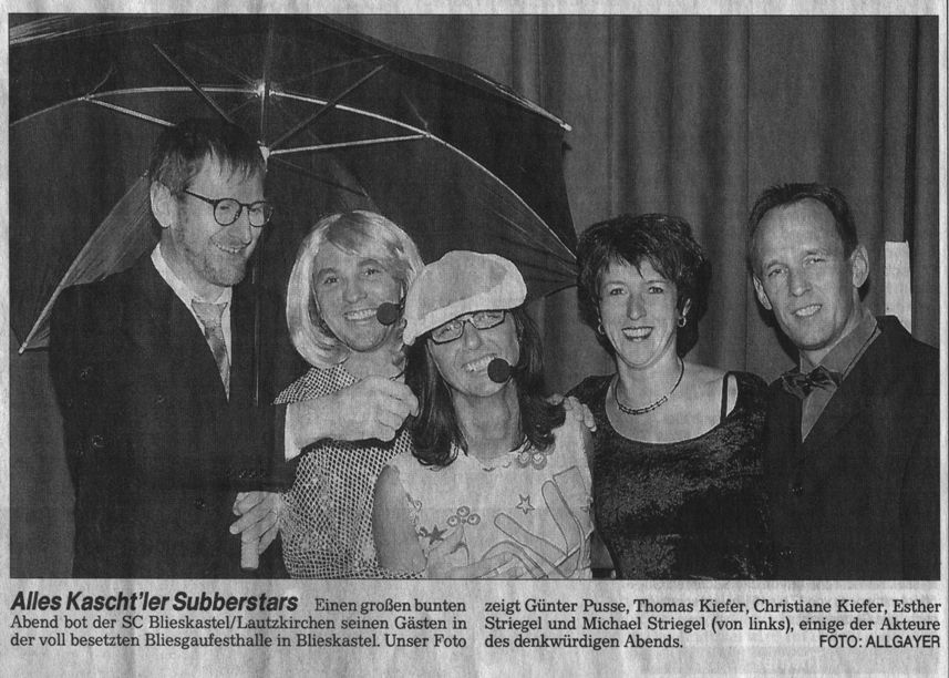 Zur Eröffnung zeigten F- und E-Jugendliche mit der Einradgruppe Blies hohe Kunst auf dem Einrad. Mit einem ausgewogenen Liederreigen bot der MGV Liederkranz (Leitung Karl-Josef Stopp) die Vorlage zur Entscheidung "Kaschtl sucht den Subberstar". Manfred Baus begrüßte dabei Daniel Kübelböck (Christiane Kiefer), Frank Sinatra (Günter Pusse), Wolfgang Petry (Werner Agne), Michael Holm (Michael Martin) sowie Reinhard Mey (Thomas Kiefer) und Nena (Eva Dawo). Mit ihrem ausgezeichneten Live Gesang hatten Pusse, der zudem als Helge Schneider die Stimmung anheizte, sowie die smarte Eva Dawo die Jury überzeugt und den Sieg eingefahren.